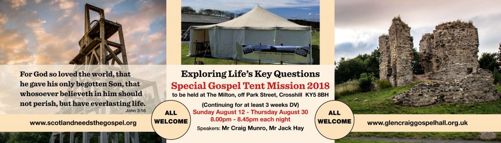 Craig Munro and Jack Hay will be preaching the gospel in the tent, God willing, for 3 weeks or so starting Sunday 12th August. The leaflet (and this site) will have more details in due course.
