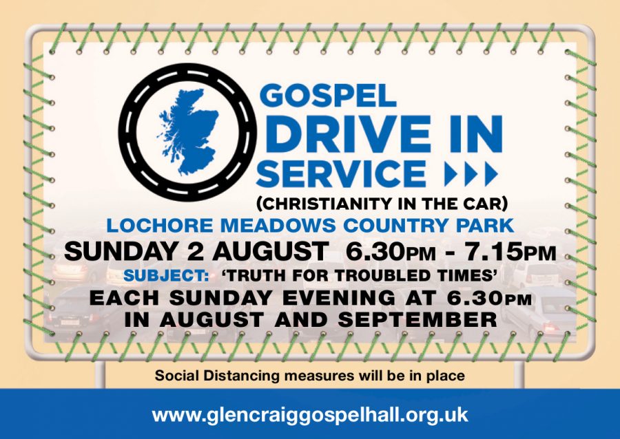 It has been a long time! For months we have not been able to have any services in the Glencraig Gospel Hall. While we are now able to meet at the hall there is a cap of 50 people maximum. Knowing that many of you want to attend a Christian service we have created a drive-in service at Lochore Meadows Country Park. This short service will take place each Sunday throughout August and September at 6.30 p.m. starting Sunday August 2.